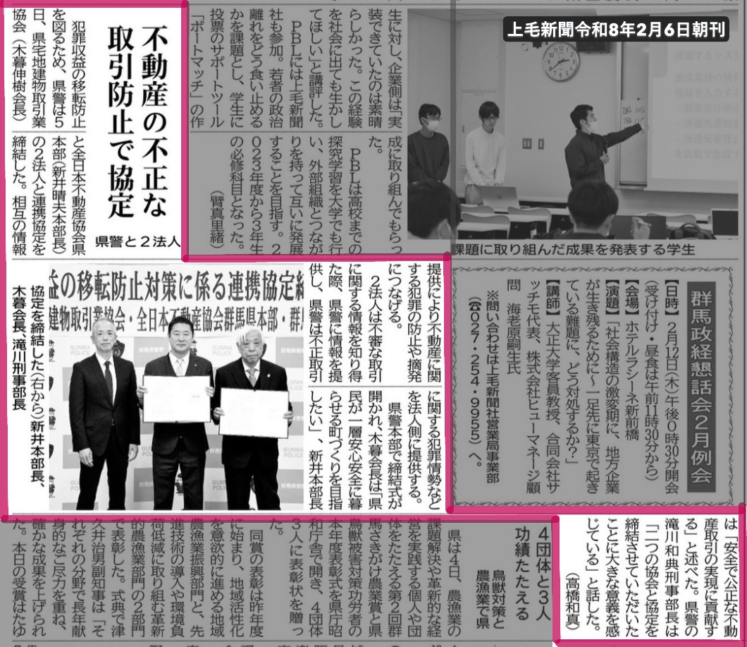 令和8年2月5日群馬県警と(一社)群馬県宅地建物取引業協会と全日本不動産協会群馬県本部の2法人は、犯罪収益移転防止を図るために、連携協定を締結しました。